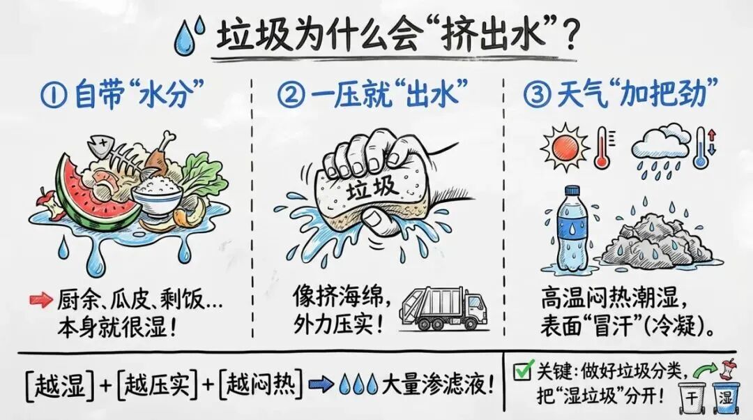 每天,咱们这座城市都会产生成堆的生活垃圾。你可能不知道,这些垃圾在转运站暂存时,会“流”出一种特殊的污水——垃圾渗滤液。这种液体颜色深、味道重,如果直接排放,对环境和健康影响可不小。那么,这些“汤汤水水”最后都去哪儿了?又是怎么被安全处理掉的? 垃圾为啥会“挤出水”?渗滤液的产生,其实和咱们生活中很多现象很像:自带“水分”:像瓜皮、菜叶、剩饭这些厨房垃圾,本身就含有很多水分,一堆积起来,水就慢慢渗出来了。一压就“出水”:垃圾车在转运站压实垃圾时,就像用力挤一块湿海绵,藏在垃圾里的汁水就被压出来了。天气“加把劲”:夏天温度高,或者雨季空气潮湿时,空气中的水分容易在垃圾表面凝结,就像冰饮料瓶“冒汗”一样,让渗滤液变得更多。