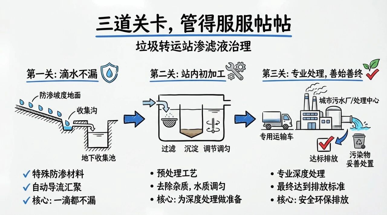第一关:滴水不漏的收集系统。现在的垃圾转运站,地面都铺着特殊的防渗材料,像个大托盘,一滴都漏不下去。地面还设计成有坡度的,让液体自动流向专门的收集沟,最后全部汇入地下的收集池。第二关:站内“初加工”。收集到的渗滤液不会直接拉走,而是先在站内进行预处理。经过过滤、调节、沉淀这几步,把里面的杂质去掉,水质调匀,为后面的深度处理做好准备。第三关:专业处理,善始善终。预处理后的渗滤液,由专用车辆运到城市污水处理厂或专门的渗滤液处理中心。在那里,经过一系列工艺处理,最终达到排放标准。处理后的水可以安全排放,剩下的污染物也会得到妥善处置。