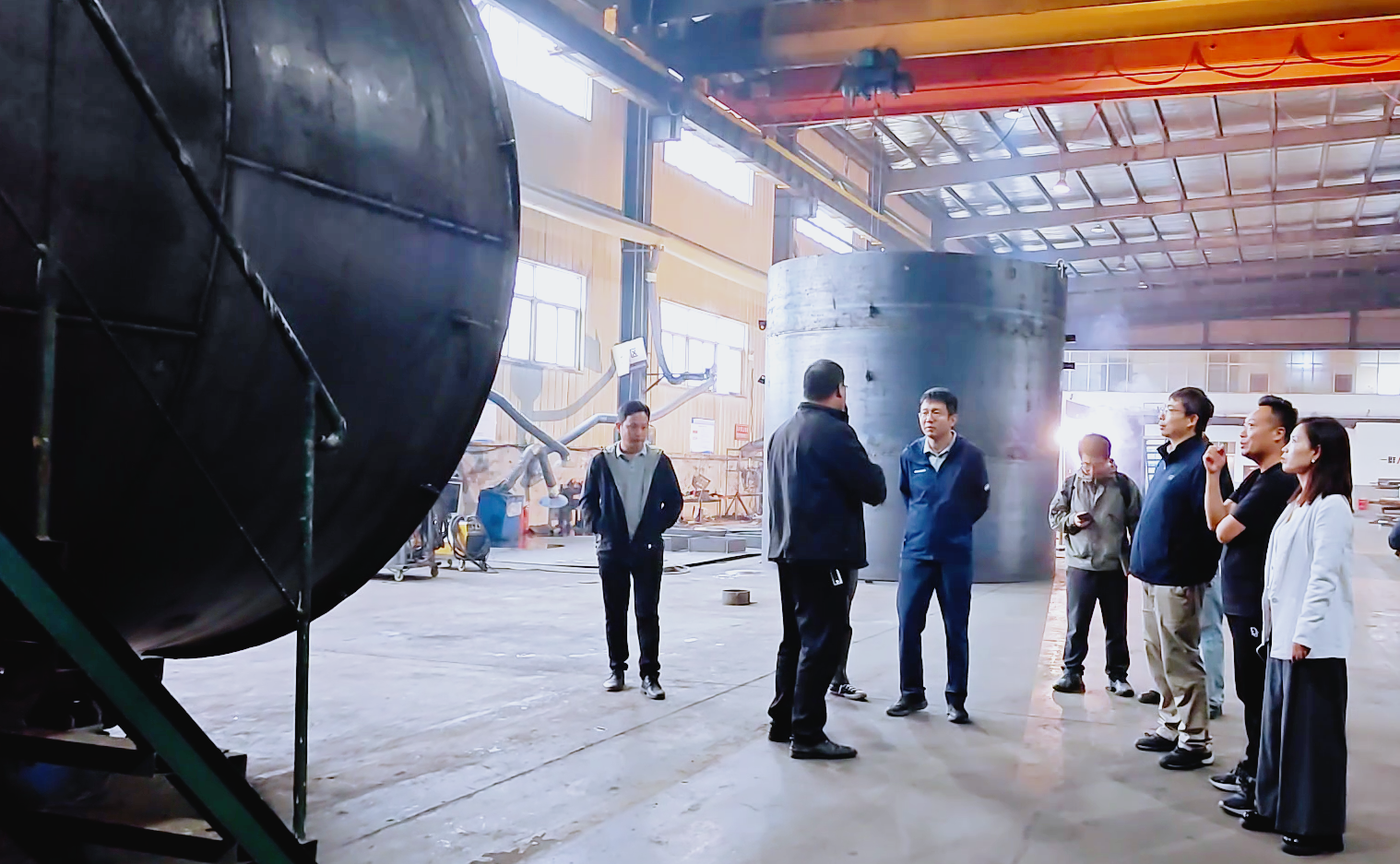 座谈会后,公司领导陪同王东琦教授一行深入公司生产加工车间进行实地参观。于前伟细致介绍了从原材料入库到成品出库的全流程,重点讲解了环保设备的核心制造环节、关键部件的精密加工工艺以及严格的质量管控体系。在参观过程中,团队不仅观摩了生产设备的操作演示,还就技术细节进行深入交流。通过此次车间参观,高校团队对企业的实际生产能力、工艺水平及质量保障有了更加直观和全面的认识,进一步感受到公司将技术创新成果转化为实际产品的落地能力。