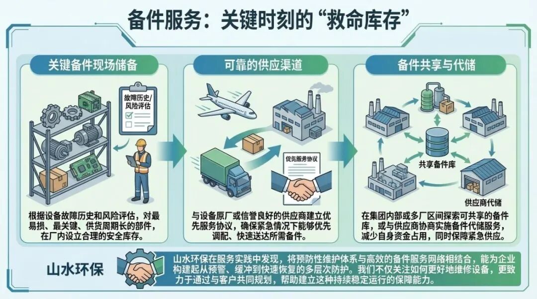 快速响应的另一大支柱是高效的备件服务,等待备件往往是停机时间被拉长的最主要原因。应根据设备故障历史和风险评估,对最易损、最关键、供货周期长的部件在厂内设立合理的安全库存,并与设备原厂或信誉良好的供应商建立优先服务协议,确保紧急情况下能够优先调配、快速送达所需备件。此外,可以在集团内部或多厂区间探索可共享的备件库,或与供应商协商实施备件代储服务,减少自身资金占用,同时保障紧急供应。山水环保在服务实践中发现,将预防性维护体系与高效的备件服务网络相结合,能为企业构建起从预警、缓冲到快速恢复的多层次防护。我们不仅关注如何更好地维修设备,更致力于通过与客户共同规划,帮助建立这种持续稳定运行的保障能力。每一次故障处理完成后,都要进行复盘分析,查明故障根本原因,反思响应环节哪里可以更快、备件储备是否合理,通过持续优化预案、更新维护策略、调整备件库存,让应急机制越来越敏捷可靠。