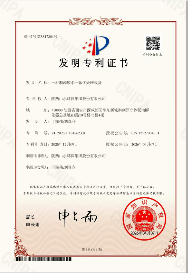 近日,陕西山水环保集团股份有限公司收到国家知识产权局颁发的发明专利证书,专利名称为“一种制药废水一体化处理设备”(专利号:ZL202511842623.8),授权公告日为2026年4月7日,专利申请日为2025年12月9日。